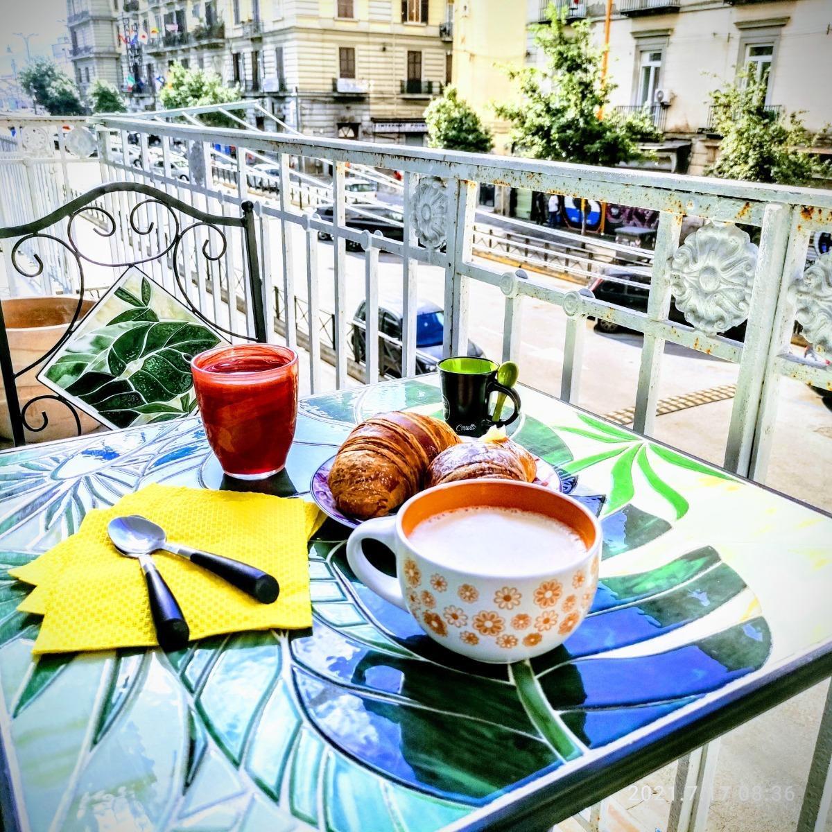 Napoli Naif offers a typically Italian breakfast consisting of the classic ristretto coffee, milk and fresh croissants every morning. A breakfast like at home or at the bar to be able to immerse yourself in the typical traditions of the place. At guests' disposal there are always sweet and savory snacks, fruit juices, coffee, tea and herbal teas to satisfy an afternoon or evening craving.